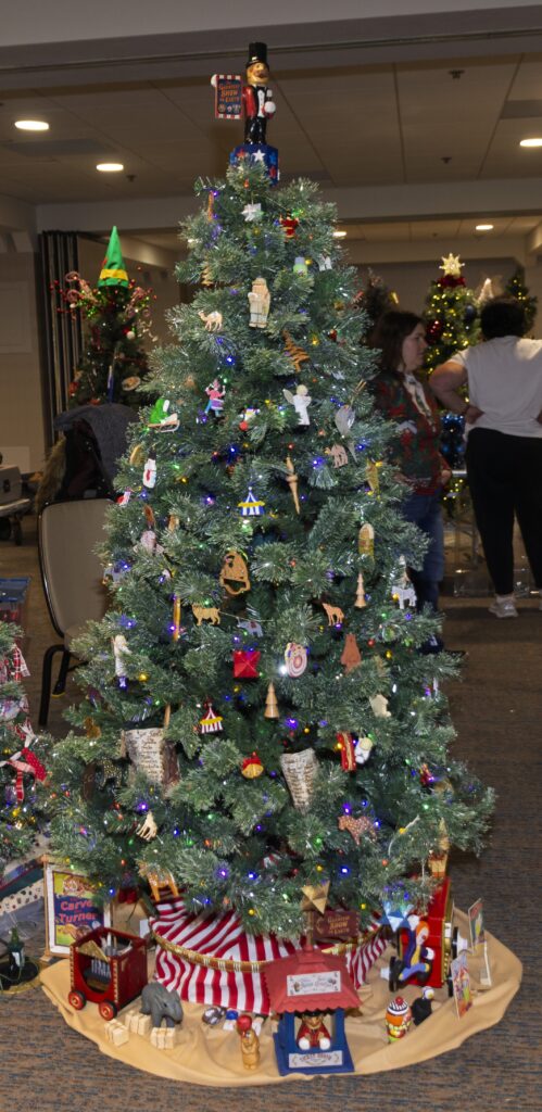 The 2025 theme for our tree is an old fashioned, Big Top Circus. The Rochester Woodcarvers were again joined by the Zumbro Valley Woodtruners in creating handmade, wooden decorations for the Festival of Trees. Since they made the tree, the circus is named after them.