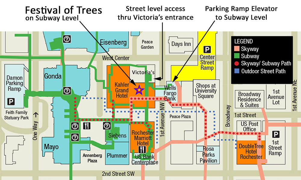 The Festival of Trees will be in the Kahler Grand Hotel’s Heritage Hall on the subway level. The trees will be open for public viewing on: